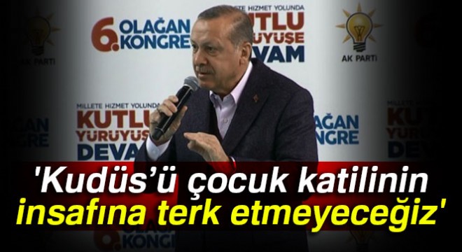 AK Parti Sivas İl Başkanlığının 6. Olağan Kongresinde konuşan Erdoğan, 14 yaşındaki bir çocuğu gözaltına alınan ve gözleri bağlı olarak sorguya götüren işgalci İsrail askerlerine sert tepki gösterdi. “Bu İsrail terör devletidir, terör” diyen Erdoğan, “Kudüs bizim gözümüzün nurudur, Kudüs’ü çocuk katili bir ülkenin insafına terk etmeyeceğiz. Kudüs’ü işgal ve yağmadan başka hiçbir değeri olmayan bir devletin vicdanına da bırakmayacağız” ifadelerini kullandı.