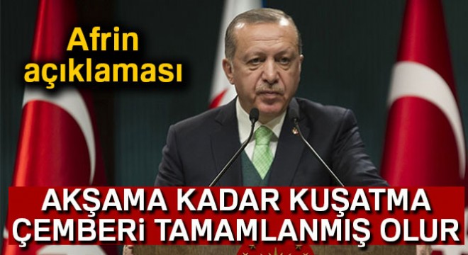 Cumhurbaşkanı Recep Tayyip Erdoğan, Zeytin Dalı Harekatı kapsamında 3 bin 444 teröristin etkisiz hale getirildiğini belirterek, “Afrin’e biraz daha yaklaştık. Temenni ederim ki, akşama kadar kuşatma çemberi tamamlanmış olur” dedi.