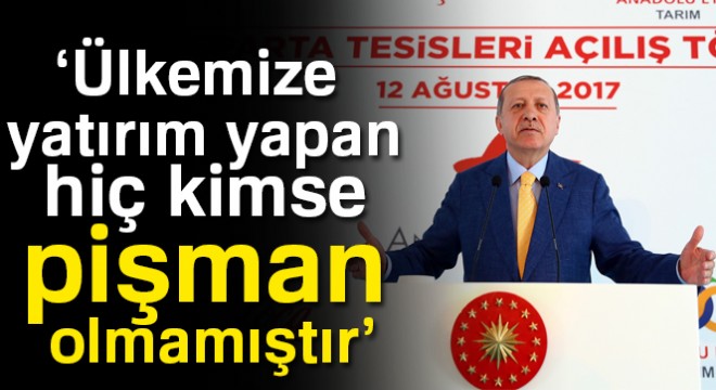 Erdoğan, "2002-2016, 14 yıl içinde ise aldığı yatırım 181 milyar dolar. Nereden nereye geldik. Gerek yatırım destek ajansı gerek diğer ilgili kurumlar olarak yatırımcılara her türlü desteği sağlamaya hazırız. Türkiye’nin hem kendi potansiyeli hem de bölgesel konumuyla yatırımcılara gelecek olarak büyük avantaj sunuyor olmasıdır. 50-100 kişi bu fabrikada çalışıyor olabilir ama binlerce üretici meyvesini burada işleme sokacak. Hükümetimiz ülkemizdeki yatırım ortamını hem yerli hem de yabancı yatırımcılar için cazip kılacak önlemleri aldı, almaya devam ediyor. Birilerinin sürekli gündeme getirdiği olağanüstü hal sadece terörle mücadele ile sınırlıdır. Olağanüstü hal girişimcilerimizin, sanayicilerimizin yaptığı yatırımların önünü kesmeye değil onların güvence altına almaya yöneliktir. Sağladığımız teşviklerle girişimcilerimize büyük imkanlar sağlıyoruz. Tük ekonomik göstergeler olumlu yönde bir seyri gösteriyor. Turizmde de benzer bir durumla karşı karşıyız. Yöneticisi oldukları medya kuruluşlarında Türkiye’yle ilgili olumsuz kampanya yürütenlerin, tatillerini ülkemizde geçiriyor olmaları söyledikleri yalanlara kendilerin de inanmadıklarını gösteriyor. Bugüne kadar badireler atlatan Türkiye, bu iftira kampanyalarının da üstesinden gelecektir" dedi.