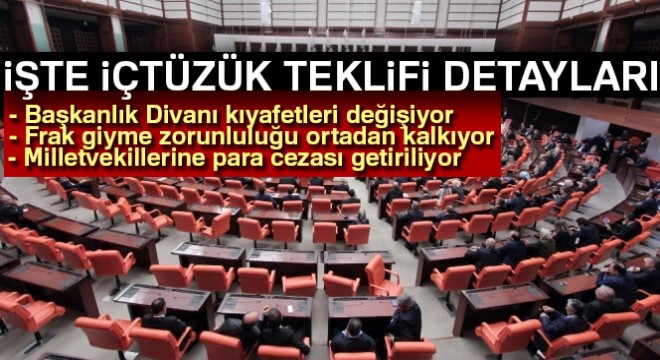 İçtüzük teklifi AK Parti ve MHP ortak teklifi olarak 18 maddeden oluşuyor. Teklifte, Türkiye Büyük Millet Meclisi Genel Kurulu, Salı günü saat 15.00’ten 21.00’e, Çarşamba ve Perşembe günleri saat 14.00’ten 21.00’e kadar toplanacağı belirtilerek, Türkiye Büyük Millet Meclisi vasıtasıyla yapılacak TV yayınında, önemli ve özel haller saklı kalmak kaydıyla bu fıkrada düzenlenen toplantı günleri ve saatleri esas alınacağı ifade edildi.
